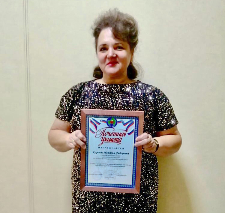 Старшая медицинская сестра кардиологического отделения Новозыбковской ЦРБ Наталья Карпова награждена почётной грамотой от Ассоциации сестринского персонала Брянской области за победу в конкурсе на лучшее стихотворение для сборника, посвященного профессии медицинского работника. Конкурс организован Российской Ассоциацией медицинских сестёр.