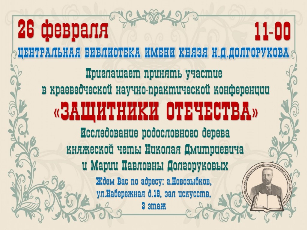26 февраля Центральная библиотека имени Н.Д. Долгорукова проводит научно-практическую конференцию «Защитники Отечества», посвященную исследованию родовых корней княжеской четы Долгоруковых.