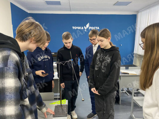 В кабинете физики девятиклассников мы застали за лабораторной работой. Ребята вместе с учителем Риммой Онучиной проходят тему «Механические колебания» и сейчас определяют зависимость периода и частоты от длины нити математического маятника.