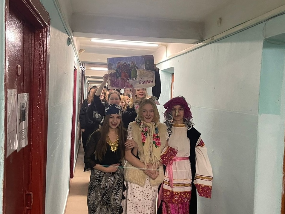 В общежитии педколледжа ребята нарядились в традиционные одежды и радовали своих сокурсников колядками, частушками и прибаутками. В сопровождении «козы» они отправились щедровать. А после колядований, как и положено — наступило время девичьих гаданий. При свечах девчата гадали на судьбу, богатство, суженого.