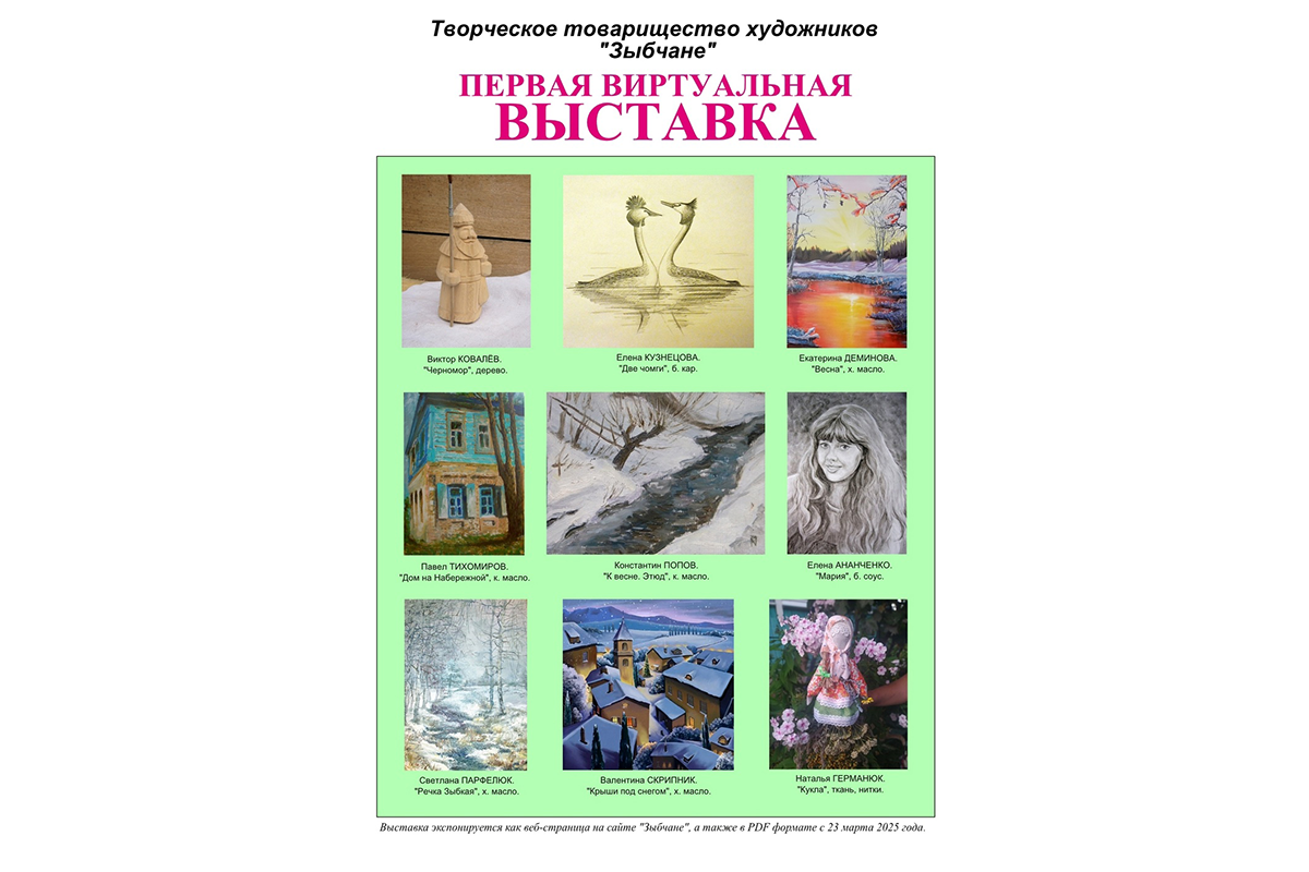 Художники Новозыбковского округа открыли виртуальную выставку. Теперь все желающие могут насладиться работами членов творческого товарищества «Зыбчане» в электронном виде на сайте арт.новозыбков.су. Выставка начала свою работу 23 марта. Она стала одним из запланированных и теперь реализованных проектов нового объединения. Участников проекта пока не так много, группа только набирает силу. Представлены работы девяти авторов: это Елена Ананченко, Наталья Германюк, Екатерина Деминова, Виктор Ковалёв, Елена Кузнецова, Светлана Парфелюк, Константин Попов, Валентина Скрипник, Павел Тихомиров. Фоторепродукции картин, рисунков и объемных работ можно скопировать себе или даже перевести в бумажный вариант. Каталог пока неполный, но со временем он будет пополняться.