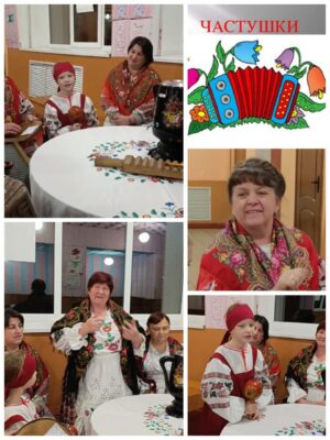 Частушка на Руси родилась среди народных гуляний под перестук каблуков. Неудивительно, что на этом вечере у всех присутствующих ноги сами пустились в пляс. Вдохновенно, с огоньком хозяева и гости вечера отплясывали русский танец, барыню и цыганочку. Исполнение задорных частушек, песни, пляски развеселили души участников, взрослых и детей, подняли настроение.