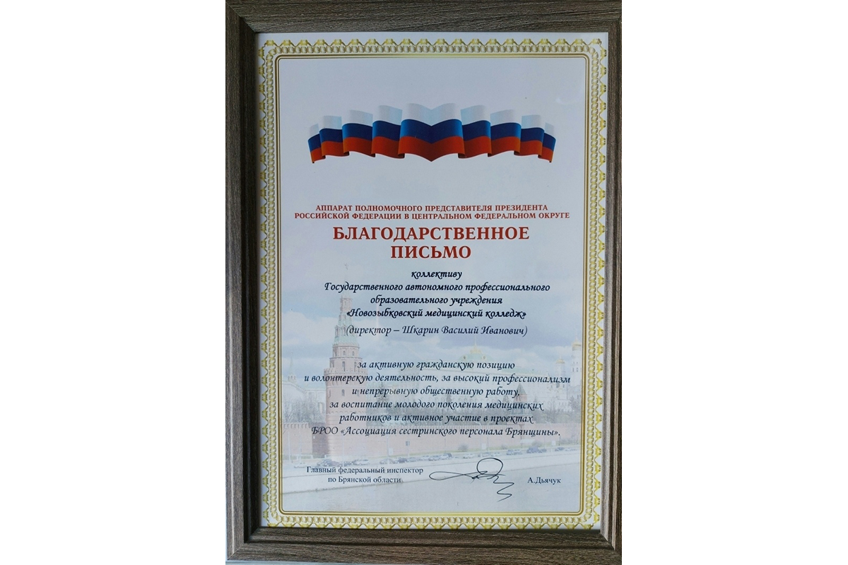 Просветительская и волонтерская деятельность новозыбковского медицинского колледжа была отмечена Благодарственным письмом.