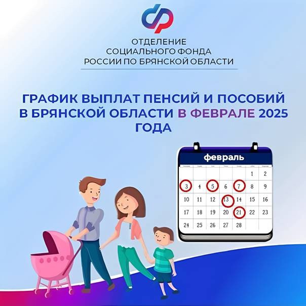Отделение Социального фонда России по Брянской области доводит до сведения граждан график выплаты пенсий и пособий в феврале 2025года.
