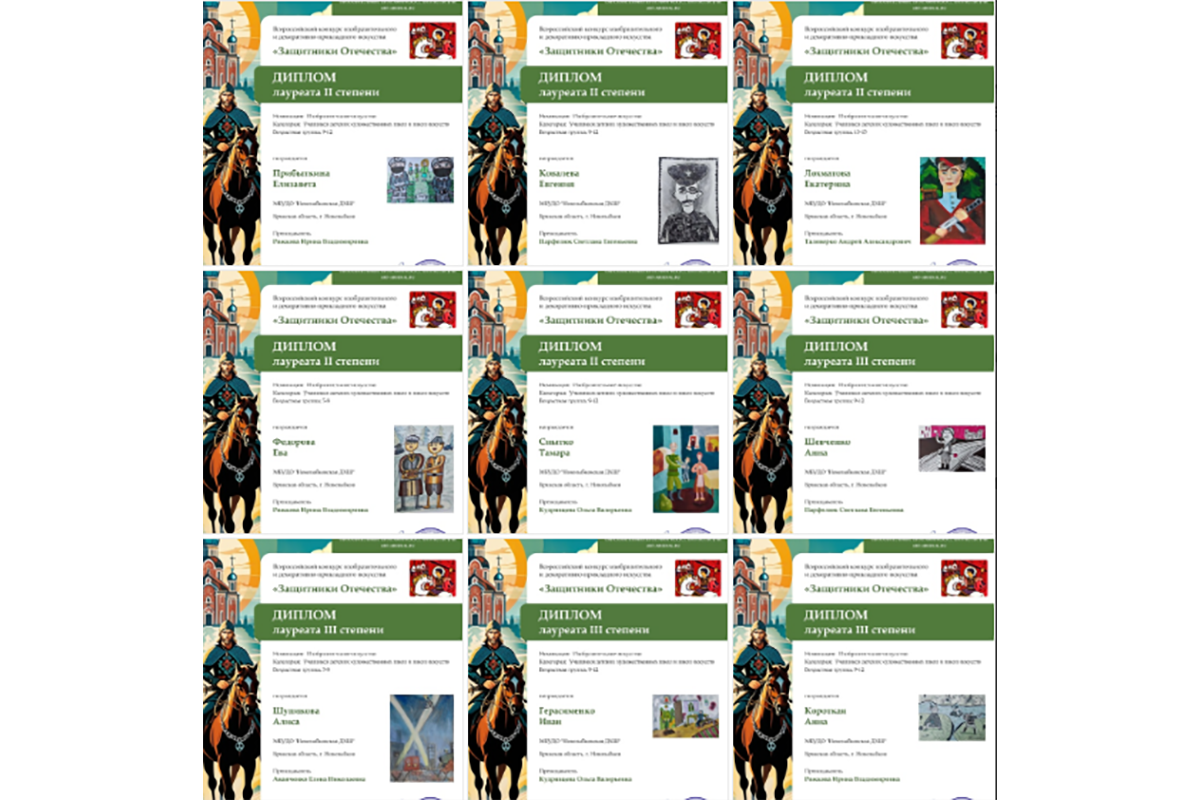 Ребята из Детской художественной школы завоевали 9 дипломов лауреатов во Всероссийском конкурсе изобразительного и декоративно-прикладного искусства «Защитники Отечества». Мероприятие организовала и проводила автономная некоммерческая организация дополнительного профессионального образования «Арт-арсенал образовательных программ искусства и культуры». В состав жюри были включены деятели отечественной культуры, члены Союза художников России, представители Российской Академии художеств, руководители и специалисты детских школ.