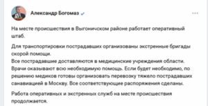 Все пострадавшие доставляются в медицинские учреждения области. Врачи оказывают всю необходимую помощь. Глава региона отметил, что в случае необходимости по решению медиков будет организована перевозка тяжело пострадавших санавиацией в Москву. Все соответствующие распоряжения сделаны.