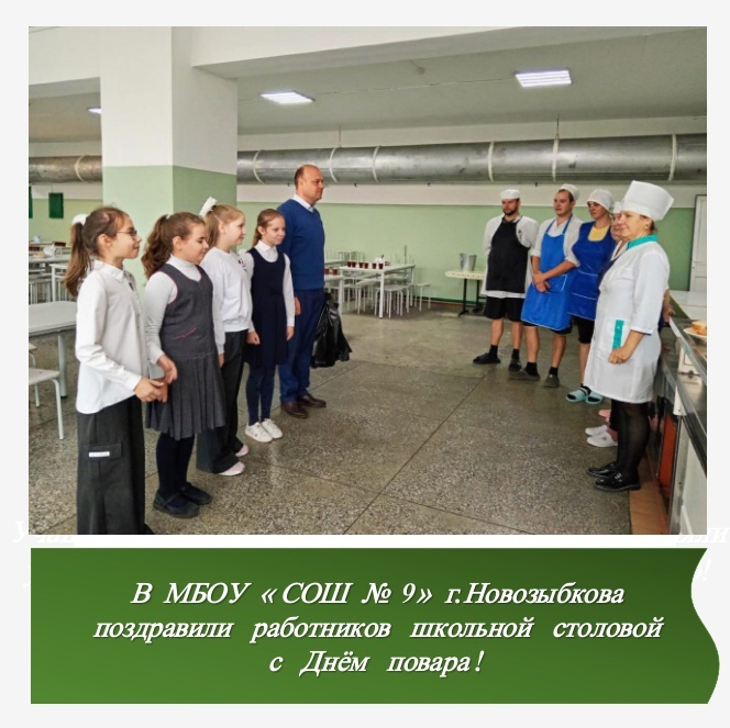 Ежегодно, 20 октября, свой профессиональный праздник — День повара — отмечают повара и кулинары всего мира. Обучающиеся школы №9 г.Новозыбкова совместно с директором Дмитрием Пешехоновым не оставили без внимания наших школьных поваров.
