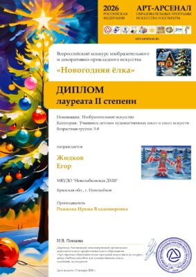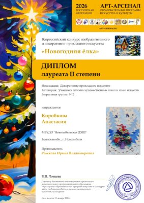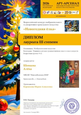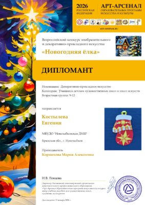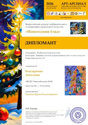 Всероссийские онлайн-конкурсы изобразительного и декоративного искусства огласили результаты. В общей сложности ученики Новозыбковской детской художественной школы удостоились более 20 дипломов. Лауреатами первой степени стали Любовь Кабанова, Мирослава Ковалева, Александра Мельникова, Василиса Емельянова. Дипломы второй степени получили Алена Лупоок, Анастасия Коробкова, Егор Жидков, Анастасия Тарануха. Дипломы третьей степени вручены Анне Горленко, Алене Шевцовой, Анастасии Кауровой, Максиму Сторожеву, Полине Иващенко, Анастасии Тарануха, Софье Гоменок, Виктории Катюшиной. Дипломантами конкурсов признаны Ангелина Бондаренко, Федор Гоголев, Евгения Костылева, Надежда Стипикова, Валерия Справцева, Елизавета Назарова, Есения Загаренко, Евгения Костылева.